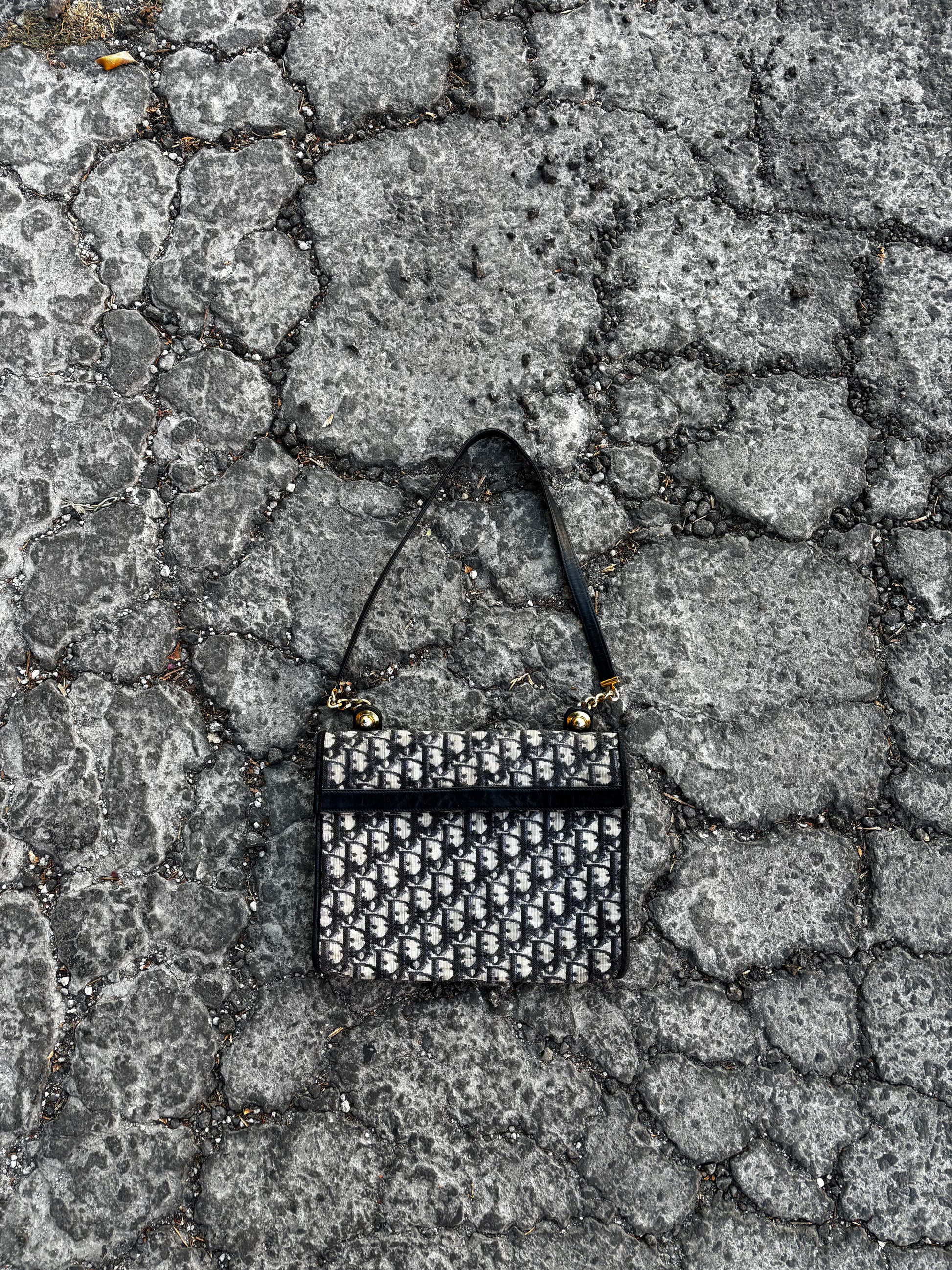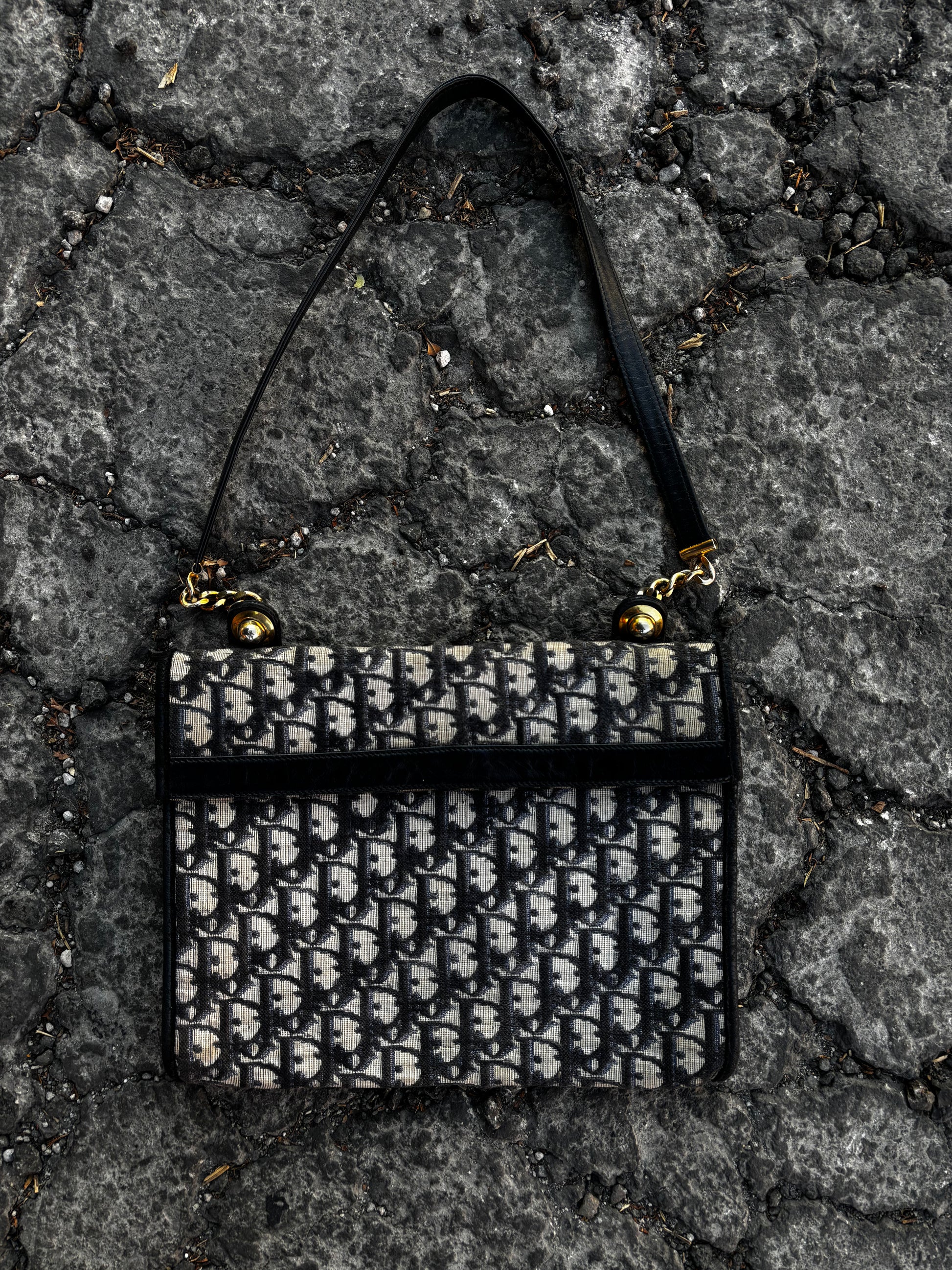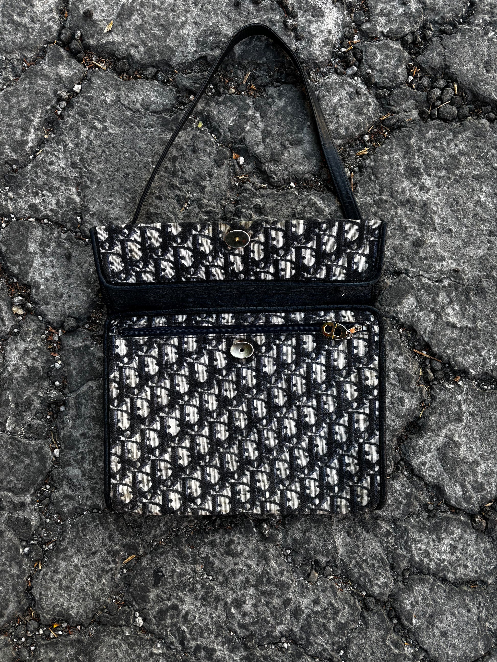 Pieza de archivo de la casa Christian Dior, este bolso vintage presenta el icónico monograma Oblique en canvas azul con detalles en cuero genuino y herrajes dorados. Una joya de diseño clásico que nunca pasa de moda.