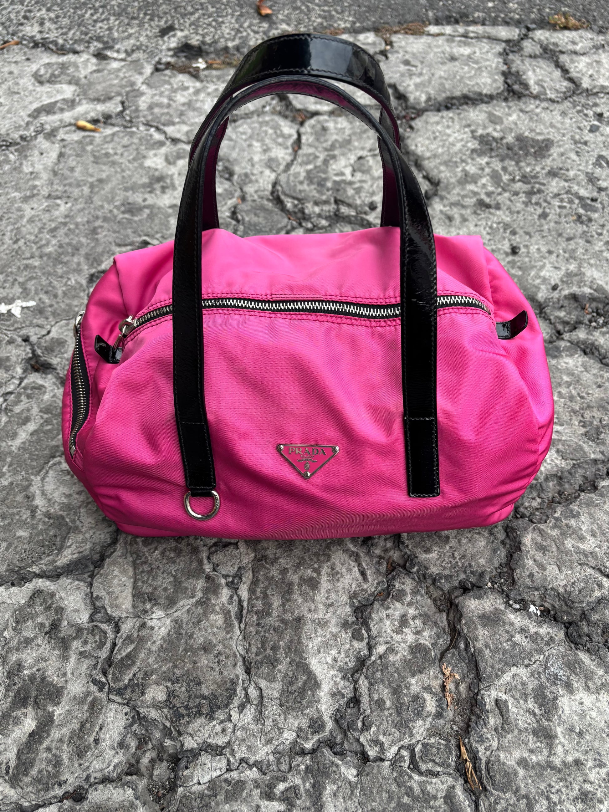 Bolsa de nylon Prada original en excelente estado general. Diseño clásico con herrajes metálicos y logo frontal triangular icónico. Presenta manchas menores visibles en las fotos. Ideal para uso diario o para completar un look minimalista de lujo.