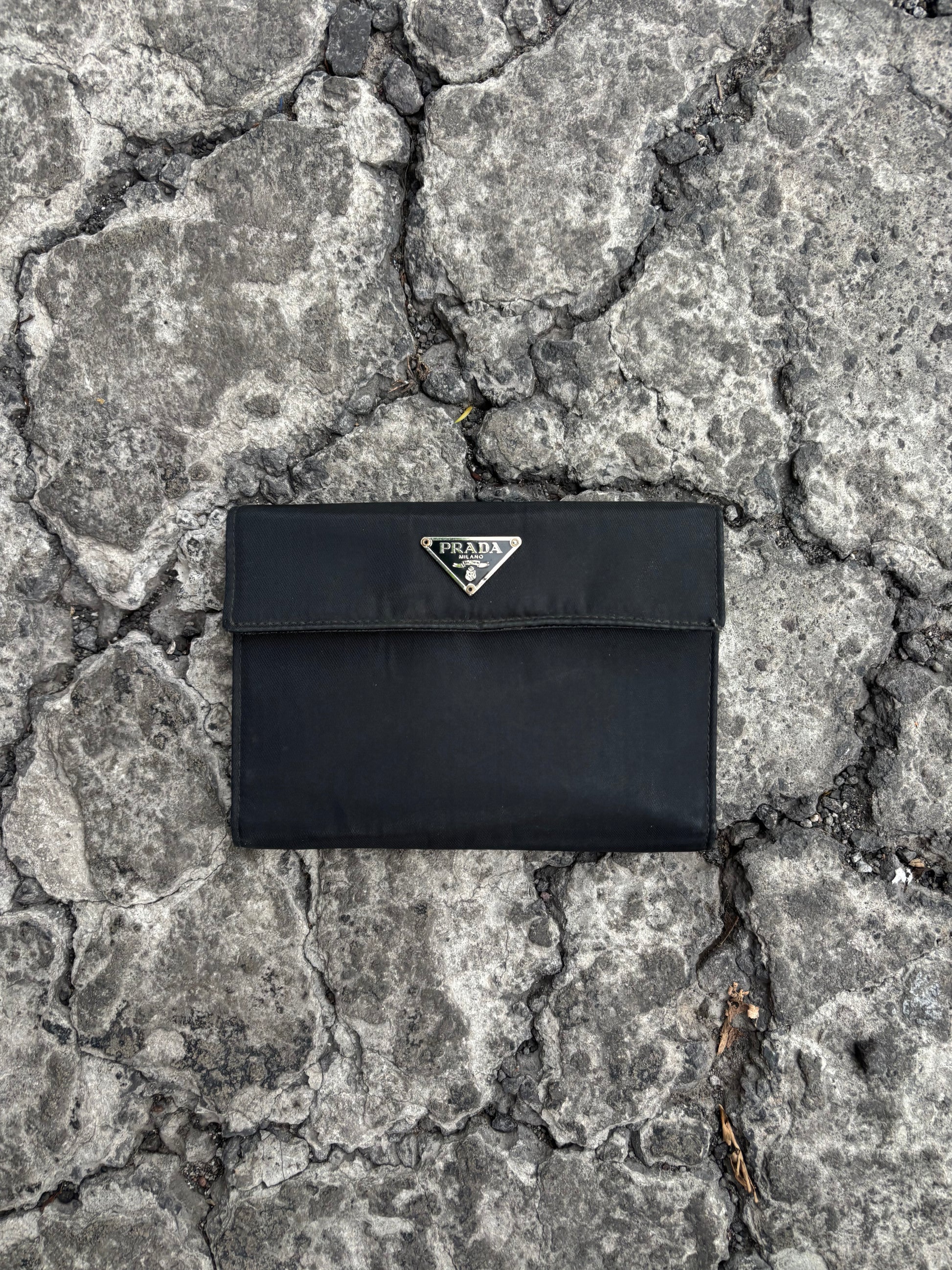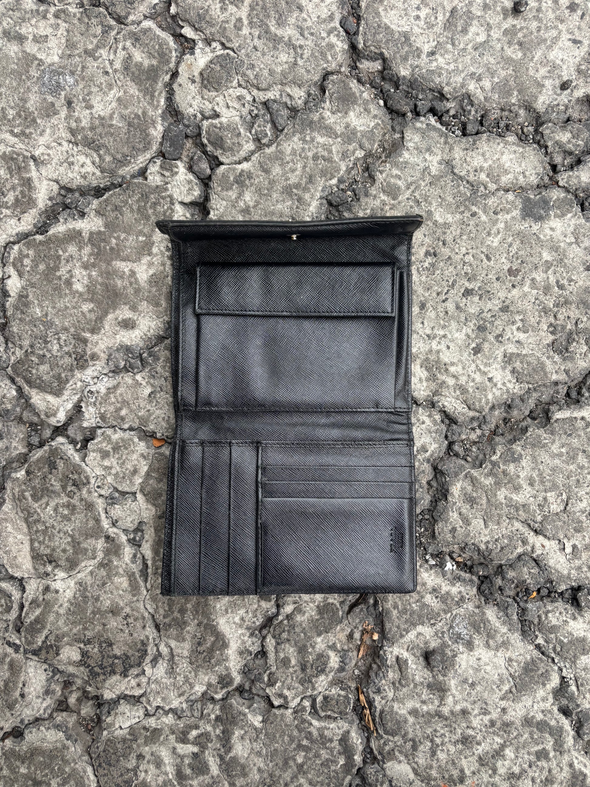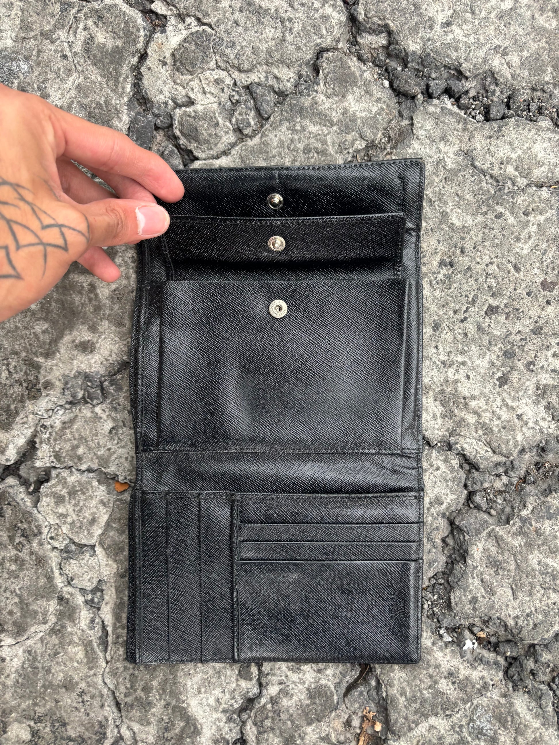 Cartera Prada clásica confeccionada en cuero saffiano negro. Hecha en Italia. Presenta señales de uso visibles (especialmente en los bordes e interior), pero mantiene su forma y funcionalidad completas. El logo metálico en el frente está impecable. Pieza funcional con mucho estilo, ideal para uso diario o colección.